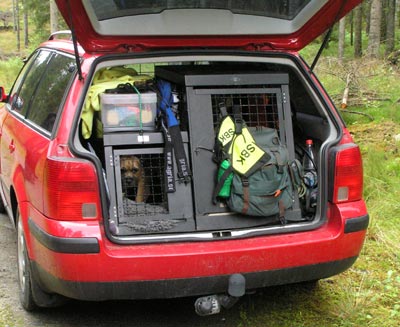 Hundbil på läger. Just här ser det kanske inte så mycket värre ut än vanligt, men baksätet…