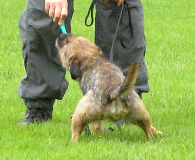 Spökschäfern i rubriken var instruktörens hund Xanga. Hon är en perfekt spökschäfer vilket vi utnyttjade till både Iza och Karlsson. För Karlssons del gick det ut på att hon vid ett par tillfällen var med i spåret och när han ”la av” så släppte Geir på Xanga i spåret mitt framför näsan på K!!! Jag har sällan sett en så snopen terrier. 🙂 Första gången fick hon ta en pinne som bara låg ett par meter fram i spåret och spåra vidare till nästa pinne med K i hasorna vilket inte störde henne det minsta. Efter det skärpte han till sig rejält. Vid ett par tillfällen var han på väg att börja käka blåbär igen men när han vände sig om och fick se att Xanga fortfarande var kvar bakom honom så kom han snabbt på andra tankar och tryckte näsan i backen. Mycket effektivt! 🙂