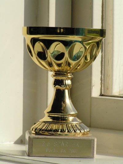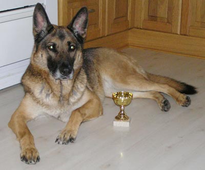 Så var den dagen över och det var bara att vänta på resultaten, vilket visade sig ta ett bra tag. Att vi inte var uppflyttade stod ju helt klart, men det hade jag inte förväntat mig heller. När det hela var färdigräknat visade det sig att vi skrapat ihop 444,75 poäng och en andraplacering (=tämligen anskrämlig bucka och en liten fodersäck)! Det är 65 poäng mer än förra gången (för ett år sedan) och definitivt ett stort steg i rätt riktning. Det fattades ”bara” 35,25 poäng (på lydnaden) för uppflyttning och det känns faktiskt inte alls som någon omöjlighet. Det finns ju som sagt poäng att hämta, med lite mer träning. Bara en 10:a på hoppet, som alltså inte ska vara omöjligt, är ju värt 30 poäng. Kan vi sedan få till ett hyfsat ställande på inkallningen, ett lugnare rörelsemönster i skallet och ett bättre framåtsändande så… 🙂 Den stackars schäfern, som för en vecka sedan var i stort sett pensionerad, kan nog se fram emot en tuff vinter. 😀