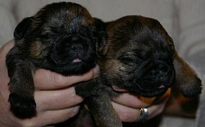 När denna bild togs var dom två veckor gamla. Jag är tämligen säker på att det är Karlsson till vänster eftersom han var den mörkare av de två bruna hanarna när vi hälsade på första gången, och även vid leveransen. Vid den här tidpunkten visste jag inte ens att jag skulle ha en borderterrier. Jag var bra sugen men hade ju bokat en cairnterrier. När den tiken gick tom såg jag dock min chans att byta ras och sen gick det fort som den minnesgode läsaren kanske kommer ihåg. När valparna var ca fem veckor pratade jag med Karin (uppfödaren) första gången, när de var sex veckor hälsade vi på och sen var det ”kört”. Och jag måste säga att det är ett av mina mer lyckade impulsköp. Ja jag tror t o m att det är det mest lyckade någonsin!