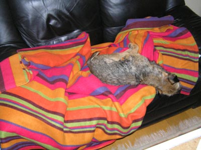 Den är fullkomligt gigantiskt (är nog förmodligen tänkt som överkast?) och även om den är dubbelvikt kan jag vira in heeela mig. Två varv. Färgerna kanske inte är de mest diskreta men å andra sidan var den gratis. 🙂 När/om jag reser mig tar K chansen, men att vara invirad tillsammans med mig? Nä, där går gränsen. Annars skulle jag tycka att det var ganska mysigt.