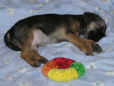 Och ännu tröttare en stund senare, djupt sovande med tvåmånaders-presenten han fått av K. Och nä, det är INTE en säng han ligger i, det har hans matte bestämt. För en husvagnsmadrass + tempurmadrass som ligger på golvet i vardagsrummet kan väl omöjligt räknas som säng, eller…? 😉