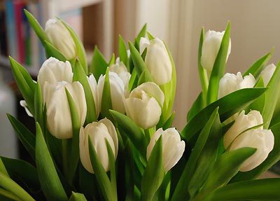 Tulpanerna fotade i lite naturligt solljus en bit från fönstret.