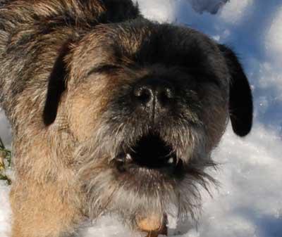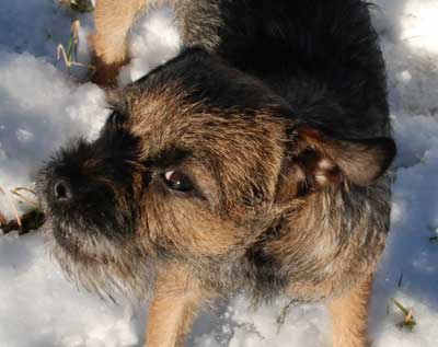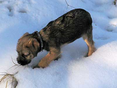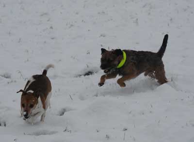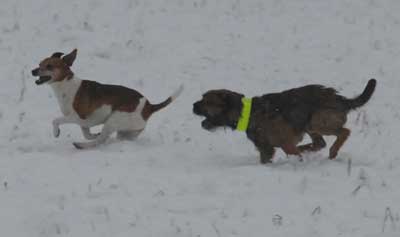 Igår fick Karlsson flickbesök, eller snarare tantbesök. Olga, dansk-svensk gårdshund på 7 år, kom och hälsade på. Vid det laget hade det, under loppet av två timmar, ramlat ner ca 1 dm blötsnö som de rusade runt i. Några kort blev det, men ganska mörka (trots photoshop-trixande). Är dock ändå imponerad med tanke på det urusla ljuset, dimman och snön som fortfarande föll.