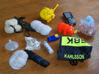 Detta var vad jag släpade med mig idag. Fyra uppletandeföremål, två pip-leksaker, en korvpåse, ett tjänstecken, en leksak i snöre, en klicker, ett cerat, en telefon och en extra pip (den vita bubblan till vänster) som alltid ligger i fickan som ”nödbroms”. 🙂 Koppel och halsband hade jag också med mig, helt i ”onödan”.