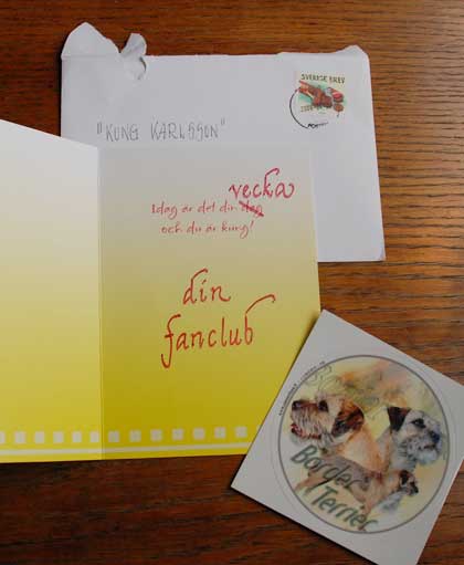 Jag har även bokat trimtid till terriern. Det blir på söndag eftermiddag. Jag är ganska säker på att han INTE tycker den idén är god. Men han brukar pussa mycket på V under tiden. Förmodligen är det ett surrogat för vit flagg? Men eftersom jag idag anmält honom till Årets Border sista helgen i maj är det dags att börja putsa.