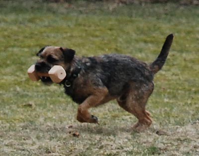 Apportering: 5,5/5 slarv, tugg, släpper (precis när han skulle svänga in rumpan och sätta sig släppte han apporten, nosade på den, tog den igen och lämnade av!)
