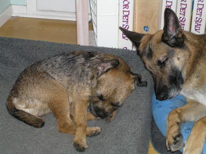 Efter hemkomsten har jag kört ett ”demolera köket-pass” med Iza. När jag började med klicker på henne så tränade jag in namnet på olika saker i köket; t ex ”stolen”, ”spisen” och att stänga lådor som var öppna. Det är riktigt länge sedan vi körde detta nu, det har fallit i glömska hos mig, och hos henne också visade det sig. Det tog ett tag innan hon var på banan, men hon hade i alla fall roligt. Att få henne att markera saker genom att ”dutta” med nosen har jag misslyckats med, hon är inte direkt den diskreta typen. Här är det tassarna som gäller, med klor och allt, vilket innebär att man får tänka sig för lite, eller köra korta pass för att minimera skadorna på inredningen. Men som sagt, vi hade ganska roligt och nu sover de nöjt båda två.