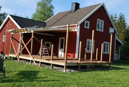 Igår kväll invigde vi altanen genom att äta middagen där, i kvällssolen. Passagen från dörren och ut på den färdiga delen av golvet var lite … spännande, men det gick. 🙂 I morse provade jag även hur det kändes att äta frukost där ute. Det kändes bra! Den utskjutande delen har sol från ca 06.00 (till 20.00), och finns det något ljuvligare än att äta frukost ute? Det är en passion jag har, men sällan har gett utlopp för. Nu ska det bli ändring på det, om bara sommarvädret är med mig.