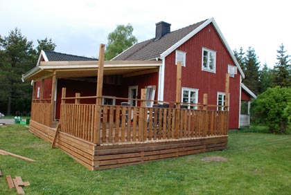 Igår blev det ingen rapport från altanbygget, men den kommer idag. Det har hänt en del sedan lördagens bild. En del synligt, en del mindre synligt. Nu återstår lite ”pill” i form av en grind som ska sitta i hålet i staketet, en trappa ner till marknivån, en altandörr som skall bytas, lite stolpar som skall hyfsas till samt några plåtar och rännor som ska på plats och… Men till helgen borde/måste det bli klart Tror jag?