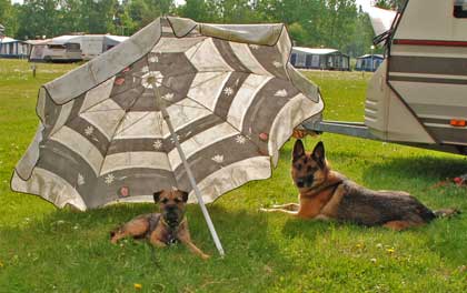Iza hade fri tillgång till skugga bakom husvagnen men envisades med att ligga och sola sig?! Den lille var, åtminstone ibland, så smart att han valde en plats i skuggan vid den riggade parasollen.