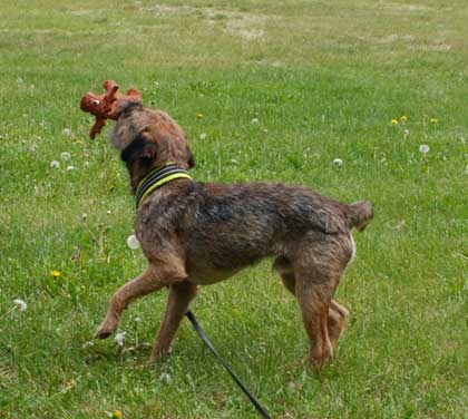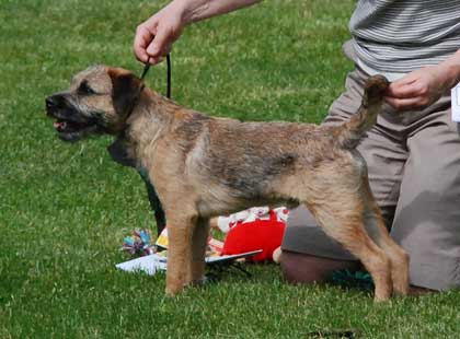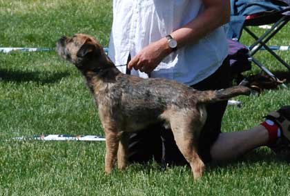 Lightly boned dog. Shoulders OK. Good length of ribs. Coat good quality. Good dept (?). Moved confidently but not strongly. Would prefer more strength in head.