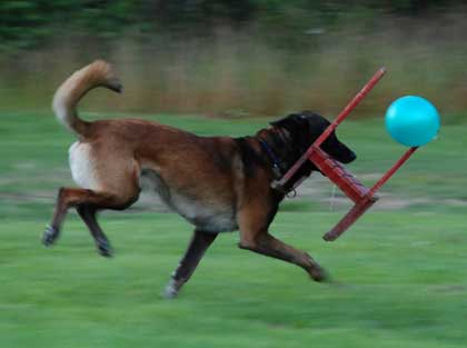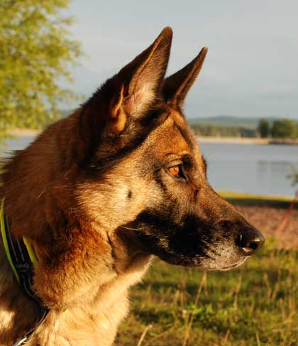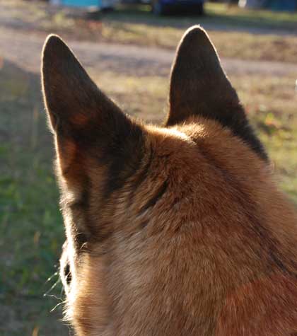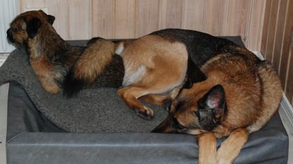 Och slutligen en bild på Gino som växt till sig betydligt sedan sist, dvs i slutet av maj, och nästan (vid åtta månaders ålder) är ikapp Karlsson. Vad månde bliva? En schäfer med hängöron kanske?