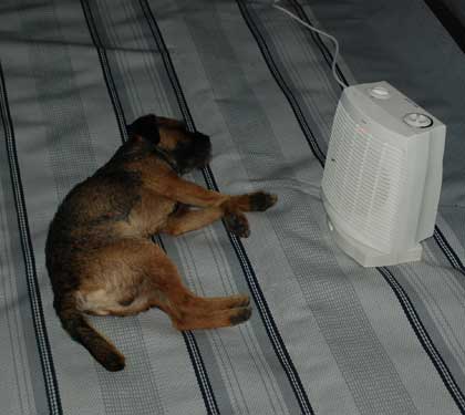 Värmeälskande terrier tycker att roterande värmefläkt från Clas Ohlsson är en utmärkt uppfinning!