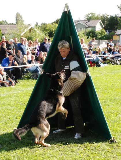 Som jag skrev tidigare så har helgen varit kanonbra. T o m vädret var ju med oss. Råkade in i ett rejält regnväder i Örebrotrakten när jag åkte upp, men jag såg blå himmel i backspegeln och den kom ikapp mig i stort sett när jag landade på campingen som låg i direkt anslutning till tävlingsplatsen. Området var helt OK, campingen jättefräsch men en del saker i tävlingsupplägget kan man (och framför allt de tävlande) ha åsikter om, men det orkar jag inte älta här. Det har varit tre trevliga dagar med trevligt sällskap, god mat, god dryck, mycket hundprat, ett par besök i puben/öltältet och, naturligtvis, tittande på tävlingarna. Dock har jag inte fotat så mycket, och igår, när det hela avslutades med planskyddet, lämnade jag faktiskt avsiktligt kameran i bilen för att få se spektaklet ”på riktigt” och inte bara genom en kameralins. Dessutom hade vi motljus där vi satt så det hade inte blivit några bra bilder ändå.