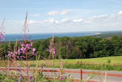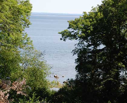 Sedan blev det lite sightseeing på krokiga småvägar och så småningom hamnade vi på ett fantastiskt smultronställe. Café Utsikten. Kan varmt rekommenderas. (Skyltar finns på väg 115 när man svängt av E6, strax innan man kommer fram till själva Båstad.) Caféet gjorde verkligen skäl för sitt namn med en vidunderlig utsikt över hela Laholmsbukten. Där intog husse sin födelsedagstårta i form av blåbärspaj. Själv var jag ståndaktig och höll mig till Ramlösa! Och det var HÄR vi hittade rejält skuggiga parkeringsplatser och för första (och enda) gången vågade lämna hundarna i bilen med lite nedvevade rutor och bakluckan på glänt med hjälp av vädringskrok.