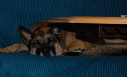 En till som slappnar av, i soffan. Hon är inte riktigt så ihopklämd som det ser ut. Bordet slutar liksom innan schäfern börjar. 😉