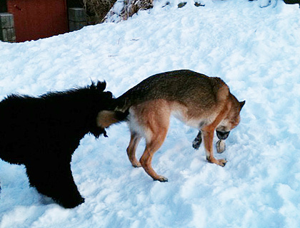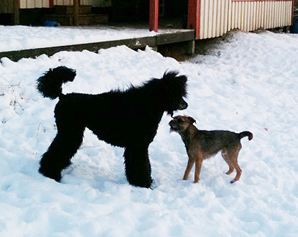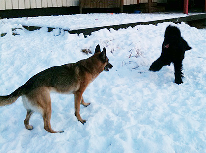 Hur som helst hade de hjärtans roligt, i båda ronderna. Karlsson missade katten som råkade befinna sig i rasthagen (men förpassades ut ganska snabbt), och Iza hittade märgben. En delikatess hon inte får hemma numera… Hur som helst är båda hundarna ganska nöjda nu. Det var dessutom Izas första date med slyngeln Vincent, och hur många snart 10-åriga schäfertikar orkar och vill flänga runt som galningar med en pudelslyngel? Troligen inte så många, men Iza förnekar inte sin barnsliga sida. 🙂
