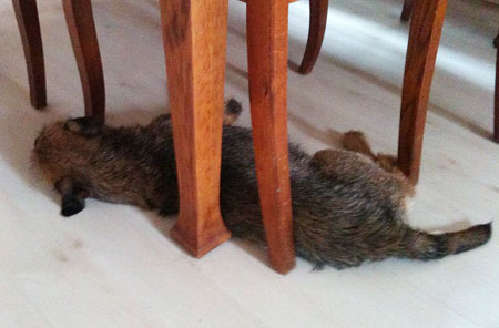 förutom den sovställning som visades på bloggen häromdagen, så kan Lazer ibland rulla ihop sig ”runt” ett bordsben…?