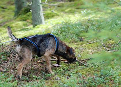 Vi åkte ut i skogen till ett ställe jag tyckte jag kände igen litegrann. Där skulle jag spåra, och då lyckades jag lura iväg tanten åt fel håll! Jösses vad naiv hon är ibland? Nåja, dom ropade åt oss att vända så det gjorde vi, och sen bar det iväg. Jag hade inga som helst problem att ta mig fram, men klumpfoten jag hade längst bak i snöret?! Vad ska jag ha henne till? Egentligen? Hon är ju fullständigt värdelös på att ta sig fram i ris, bland stenar, rötter och i nedförsbackar. Och i uppförsbackar. Det var ett himla tjoande och hojtande; ”stanna”, ”vänta”, ”oj”, ”ooops”, ”j*vlar”, ”h*ete* osv lät det hela tiden bakom mig. Hur skulle det vara om man kunde få lite arbetsro? Som hämnd för detta bestämde jag mig för att ta ett varv till i den stökigaste terrängen, och då låg hon helt plötsligt platt på rygg, baklänges i uppförsbacken? Hur gör hon?! Eftersom jag hade henne att släpa på så hann vi naturligtvis inte runt i tid, men hade jag varit ensam är jag övertygad om att jag hade fixat det. Ge mig bara en ryggsäck att stoppa spårapporterna i så… F ö sa tanten som gått spåret att hon hört oss jättelänge. ”Oss”? Jag sa ingenting…