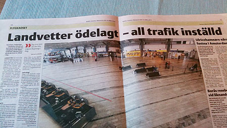Personligen tycker jag att själva avgångshallen ser ganska oskadad ut på bilden. När nätupplagan publicerades var det dock någon som hade vaknat till och korrigerat rubriken till ”Landvetter flygplats stängd på grund av vulkanutbrott”.