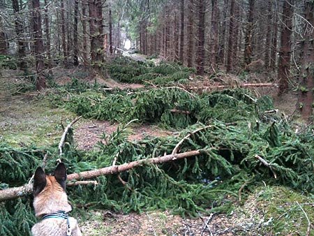 Idag gick vi en av våra favoritrundor för första gången sedan snön försvann, och … det är numera en hinderbana. Här är det normalt sett en trevlig stig av bredare typ. Nu kräver det lite mer jobb när man ska ta sig fram. Och det här är bara ett exempel från den här delen av skogen. Vi hade redan passerat x antal liknande hinder (eller värre).