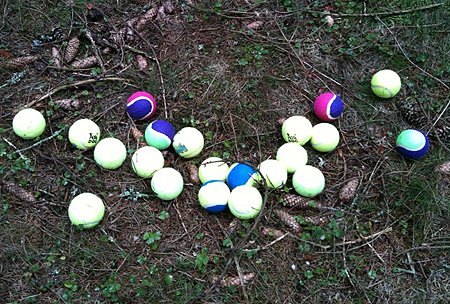 Vi påbörjade fysträningen igår med att han fick hämta 10 tennisbollar. Mer om det kan man läsa i Lennarts blogginlägg från igår. Idag hittade jag en tennisbollsgömma (ja, jag har för mycket hundleksaker) som jag glömt bort. Det totala antalet tennisbollar utökades snabbt till mer än det dubbla.