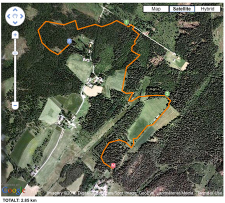Dagens spår till lilleman blev något av ett mandomsprov – nästan tre kilometer, med en pip och elva apporter! Varierad terräng; mossa, hygge, ris, åker med kortkort gräs, gammalt torrt fjolårsgräs, berghällar etc. Mestadels var han en riktigt duktig blogghund! Han spårade som bäst och mest fokuserat från 1-2 kilometer?! Vid 2 kilometer slarvade han bort sig lite, och hade jag inte vetat var spåret gick hade vi nog varit ”borta”. Men på tävling är ju spåret slut efter 1,5 så… 😉 Sista kilometern var han trött, men han fortsatte spåra. Dock mattades intresset för pinnarna markant. Han stannade och tittade lite frågande på dom. Men det kan jag ta. På det stora hela är jag jättenöjd. Spåret innehöll inga särskilda svårigheter, mer än terrängskiftena. Idag fokuserade vi på längden. Dock hade vi flera förledningsspår att reda ut, efter en grannfamilj som bitvis gått samma väg. Men vid fjärde ”krocken” struntade han fullständigt i deras spår och valde mitt utan att tveka.
