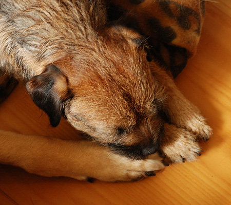 Inte nog med det. På eftermiddagen började vi pilla på hans frisyr till Årets Border. En bra stund på trimbordet blev det, ute på altanen i solskenet. Vi avslutade med kloklippning, till hans stora förtvivlan. Trim och kloklipp var nog tillsammans dubbelt så mentalt påfrestande som tre kilometer spår + uppletande. Resten av dagen har han sovit hårt, tungt och drömlöst (tror jag).