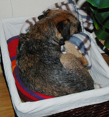 * Det kan vara rasklubbens fel. På sitt livs första utställning, Årets Border 2006, gick han och vann sin valpklass och för det fick han bl a – en fleecepläd! Han kanske behöver gå i terapi och bearbeta sin barndom?
