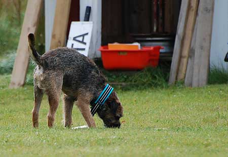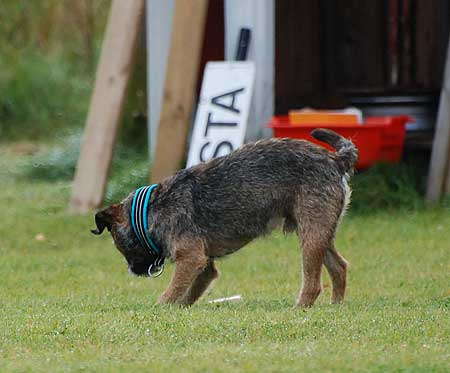 Här kommer den utlovade filmen på vittringsapporteringen från här om dagen. Jag kör med (minst) dubbelt så många pinnar som på tävling, och väldigt lite vittring på den rätta. Detta har på ganska kort tid lett till en betydligt större noggrannhet, och en betydligt lägre felfrekvens. Sista veckan (och vi har kört en om dagen ungefär) har det blivit rätt varje gång. Utom idag, då det blev fel fast det var rätt, på något vis… Husse skulle agera tävlingsledare men tänkte lite trasigt (alt. lyssnade inte när han fick instruktioner?) när han la ut pinnarna vilket ledde till att när Karlsson kom in med rätt pinne så trodde jag att det var fel, och han fick ett ”fel – loss” som tack. När husse lyckades haspla ur sig att det var rätt pinne trots allt fick jag försöka reparera skadan så gott det gick, och jag hoppas jag lyckades. Men hur svårt kan de va’ liksom…?