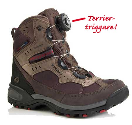 Mina nya kängor som inhandlades för ett par veckor sedan har ju inte vanlig snörning utan en ”ratt” som drar åt snörena runt fot och vrist. Ljudet som uppkommer när jag vrider åt denna ratt retar upp terrierhjärnan (och stämbanden) till bristningsgränsen.