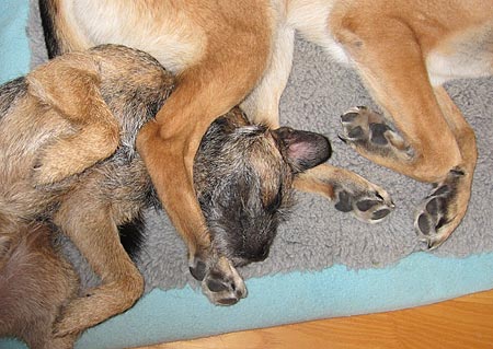 Iza, som skiter fullständigt i mina kängor bara jag får på mig dem snabbt, hänger glatt på det lilla terriertrollet och min tinnitus är bara en hårsmån bort…