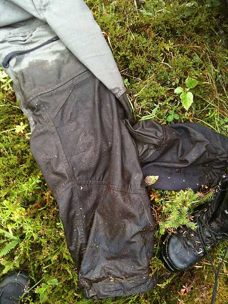 Jag är ingen hjälte när det gäller att ta mig fram på svåra ställen även om jag brukar klara en hel del när tävlingsdjävulen i mig är igång. Blöt var jag ju redan efter plumset i dyhålan så det var inte det som stoppade mig, men däremot rädslan för att halka och ramla på stenarna. Jag vet ju också att mina kängor inte har några sulor som passar på halkiga underlag, hur rejäla de än är för övrigt.