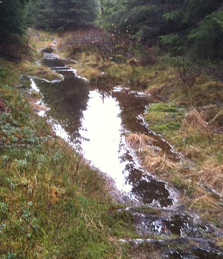 Vår i vanliga fall promenadvänliga skogsväg är numera mest en flod.