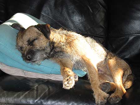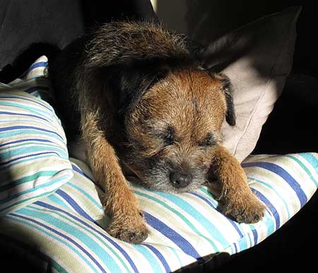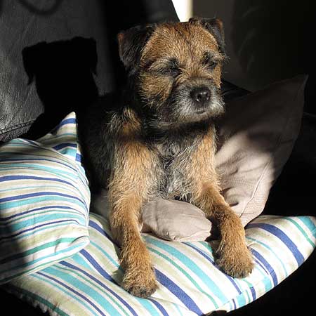Eller … bruksbordern på kuddarna? När vi kom hem idag, efter en kort visit på klubbens söktävling och ett litet träningspass, sökte den solälskande lilla hunden snabbt upp bästa fläcken i huset. Att den råkade sammanfalla med en hög kuddar störde honom inte det minsta. 🙂