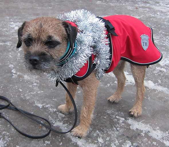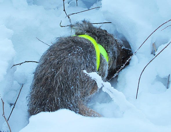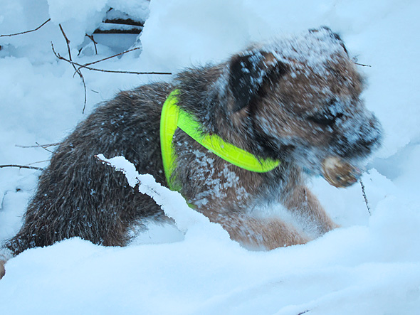 På eftermiddagens träningspromenad lyckades jag kasta lite snett. Så pass snett att bollen hamnade i ris, täckt av bedräglig skarsnö, vid sidan av vägen. Men eftersom terriern är en terrier så var det ju inget som hindrade. Snöret stack upp ur snön så jag trodde ju det skulle bli en lätt match, men se det tyckte inte terriern. Han skulle prompt ha tag på själva bollen och grävde och rotade en bra stund, med matte elakt skrattande i bakgrunden. Men att han skulle ge sig? Det fanns inte på kartan! Nu är han ju på intet sätt främmande för att bita i, och hålla i, snöret,  Det händer ju titt som tätt att han tar det istället för bollen och rusar omkring med, men inte idag.