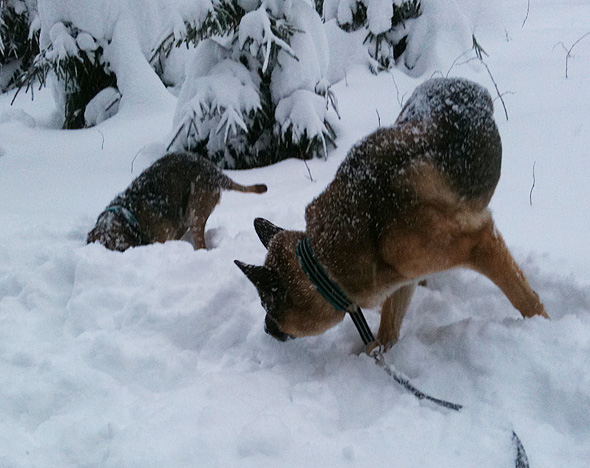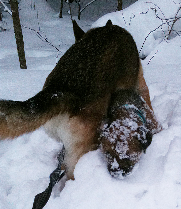 Och för att fullborda vår ”likhet” får även mina leta kulor/godis i snön. Det finns ju liksom inte så mycket annat att göra, särskilt inte för en sökhund. Men imorgon ska vi i varje fall på ridhusträning. Inte en dag för tidigt! 😮