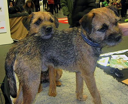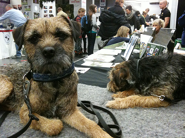 Eftermiddagen skulle ju tillbringas i rasmontern. Karlssons underbara kollega från förra året, lilla Sot, befinner sig för tillfället i Skåne, som nybliven mamma till sju valpar så att vi skulle få en ny kollega var helt klart. Den planerade lånetiken som skulle hålla Karlsson sällskap fick förhinder och igår kväll fick jag meddelande om att det istället skulle komma en hanhund, och att vi väl kunde pussla med att ha den ena i bur och den andra på bordet, och låta dem turas om. Både Karlsson och Morrisson är dock förståndiga hundar så de samsades alldeles utmärkt på bordet. Inte ett tjafsande, förutom ett litet gläfs när de möttes utanför montern. De har skött sig exemplariskt och ganska många besökare har sett milt uttryckt förvånade ut när vi informerat om att det var två vuxna hanhundar som inte kände varandra sedan tidigare. Folks fördomar om terriers, och terriertemperament, har nog fått sig en liten knäck. 😀 Som vanligt har Karlsson gjort sitt bästa för att charma publiken genom att pussa på dem och låta sig klappas, och han lyckades nog med några.