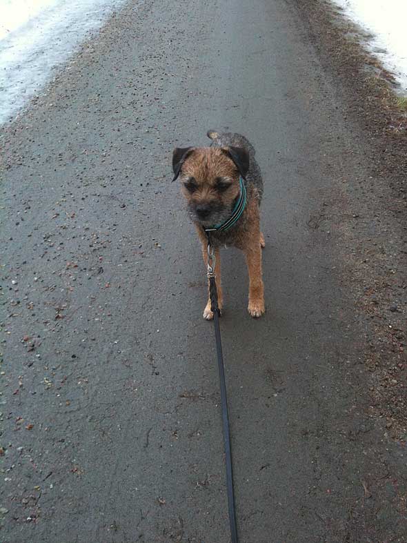 Sen fick det bli lite träning på den isfria mittsträngen på vår träningsväg. Transporterna från gruppen (utan grupp) i framåtsändandet blev det, och idag upptäckte jag att den lilla vispen faktiskt har bättre uppmärksamhet bakåt än jag trott. Jag stannade utan att säga något, rätt många gånger, och … stannade jag så stannade han, men med bibehållen riktning (=framåt). Bra så. Men, man bör ha i åtanke att brukslydnad mycket sällan äger rum på grus, med Icebug på mattefötterna. Mina fötter hördes rätt bra, milt uttryckt, men det känns onekligen som om vi har kommit en bra bit på väg. Även om transporterna varit rätt hyfsade förut också så finns det helt klart förbättringspotential. Och ”kontakten” bakåt kan nog aldrig bli för bra. 😉