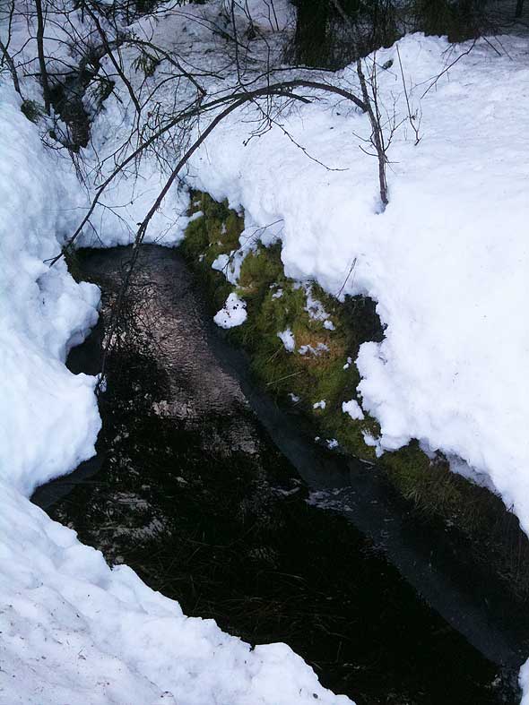 Sen hittade jag lite rinnande vatten! Och lite mossa! Det svarta i mitten ÄR rinnande vatten, och i högerkant mellan det vita och det svarta ÄR det faktiskt mossa. Så det så!