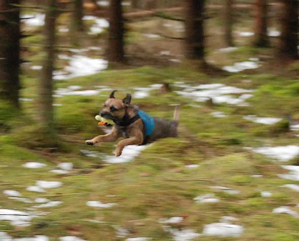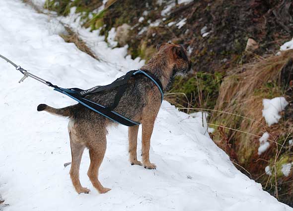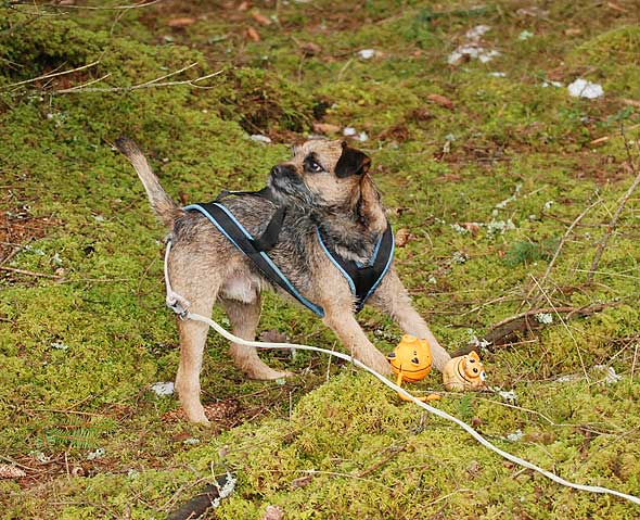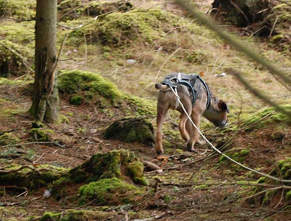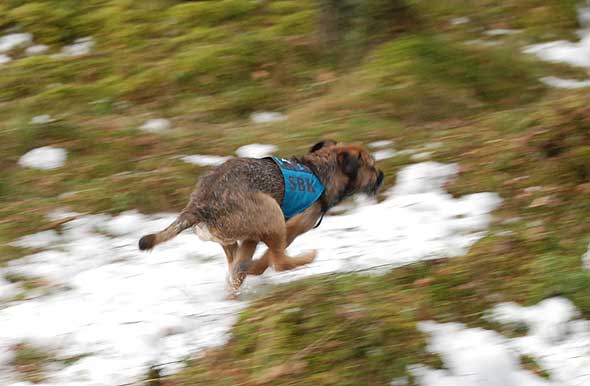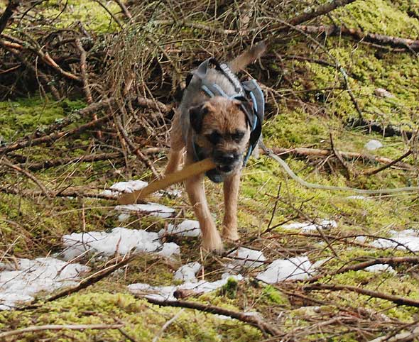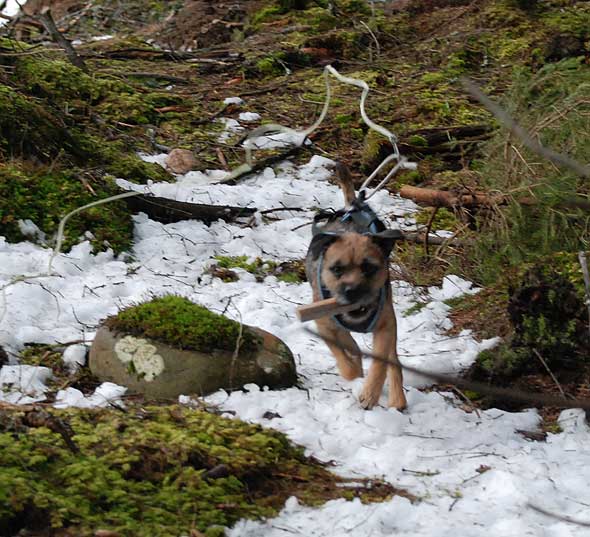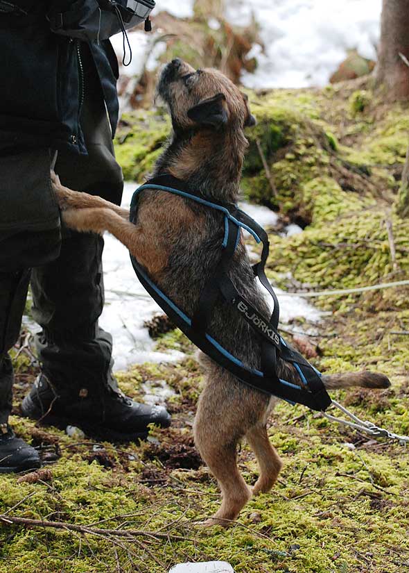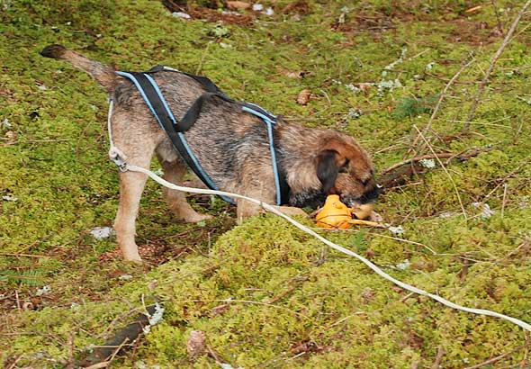 Jag fick ihop ett spår på åtminstone 3-400 meter, med upptag, och på det stora hela är jag jättenöjd. Med tanke på att han inte spårat sedan den 16:e november (två månader sedan, men det känns som två år!), och att det då var ett långt och jobbigt spår med en hel del strul och ett misslyckat slut, så är jag mycket nöjd med dagen. Han valde bakspår, men lät sig vändas utan protester (vilket inte är helt självklart), och jobbade sedan riktigt bra. Han missade två skogspinnar, varav en var ”nyplockad”, men det kan jag också leva med under rådande omständigheter. Att han var lycklig över att återse sina spår-pipisar, efter avlevererad slutapport, var det heller ingen tvekan om. 🙂
