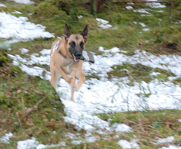 Sen blev det lite paus för Karlsson medan vi vallade en (bred) uppletandekorridor. Grappa gick ut först, och plockade snabbt in fyra föremål. Sen räckte det med bara åsynen av mallinutt för att Karlsson skulle bli tokmotiverad (läs: skrika rakt ut som en stucken gris). Det känns inte som om han har några högre tankar om malllinutter för tillfället, eftersom det enda de uppenbarligen gör är att stjäla hans uppletandeföremål. 😉 Men skit samma, så länge han köper att allt från svart cockerspaniel, till svart schäfer och ljus schäfer är mallinutter så kan jag leva med det. Och attans vilken fart och fläkt det blev. Tre föremål fick han in snabbt, sen tog det lite tid med det fjärde, men det kändes ändå helt OK.