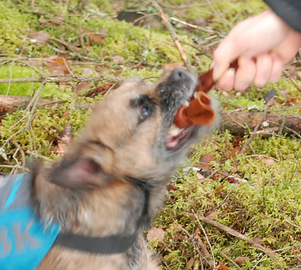 Om syftet var att få ett bättre gripande och hållande av 1-kilosklumpen var det – ett solklart fiasko. Den lille terriern tyckte att jag betedde mig oerhört suspekt, och det försökte han lösa genom att ihållande, kraftfullt och uppfordrande skälla på mig, från ca en meters avstånd, lätt backande. Inget framgångskoncept alltså.