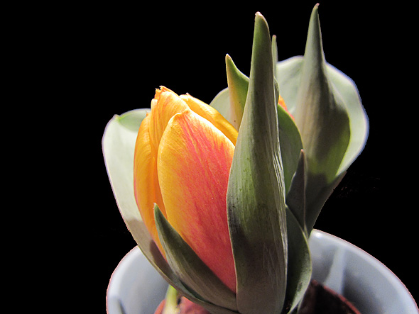 Avslutningsvis (förra) veckans tulpaner – i kruka?! Väldigt mulliga och gulliga innan vi åkte, när bilden är tagen, men utvecklingen har kanske inte varit riktigt den väntade? Vi får väl se vad som händer i veckan som kommer? Eventuellt tyckte de att det var en god idé med lite vatten som de fick idag när vi kom hem?