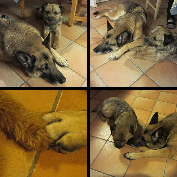 Helgens glädjeämnen har (som vanligt) varit hundarna. Gino har visat den djupaste beundran för Iza och nästan krupit ur sitt skinn för att fjäska in sig. Hon har, för första gången i sitt liv (?), uppträtt med viss värdighet, till Ginos förtvivlan och min förvåning. Han har suttit som en hare framför henne för att nå upp till hennes nos, och förmodligen sa han ”Se mig, älska mig!”, men det imponerade inte nämnvärt på pantertanten. Han ville gärna ligga ”nära”, helst nos mot nos, men när han blev alltför påträngande flyttade Iza bara på huvudet, eller drog åt sig tassen, eller… -Jag hånglar inte med smågrabbar som inte hör till familjen, verkade vara mantrat. Men inga hårda ord eller tag över huvud taget, utom när han försökte knuffa undan henne från hennes matte. Då sa hon ifrån. Inte på skarpen, men hon klargjorde mycket tydligt vilket avstånd han borde hålla just där och då, och han förstod precis. 🙂 Det lustiga är att hon inte alls varit lika ”avundsjuk” när jag umgåtts med Gino som hon är när jag gör likadant med Karlsson eller andra hundar? Som sagt; de där hundhjärnorna är inte helt enkla att förstå sig på?