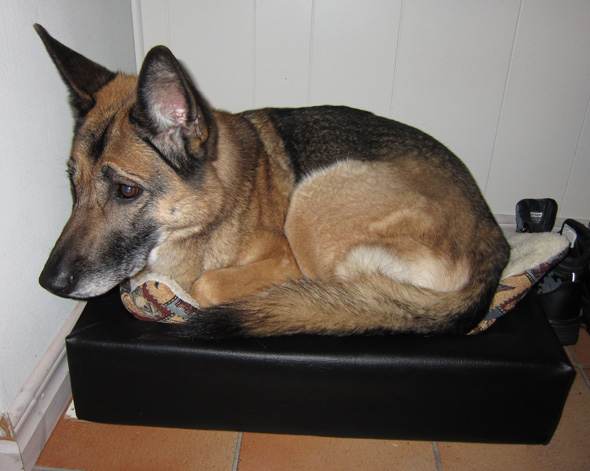 I fredags fick vi förresten ännu en gång frågan om Iza är en valp? En matte som hade tappat kopplet till sin rabiata tax, och lyckats hålla i kopplet till sin lika rabiata dvärgschnauzer, ställde frågan. Som de flesta såg hon rätt förvånad ut när hon fick facit. 🙂 Och förresten… det kanske är därför Iza vill ligga i så små bäddar som möjligt? Hon kanske håller på att regrediera till valpstadiet, men har inte förstått att kroppen inte riktigt hänger med i svängarna?
