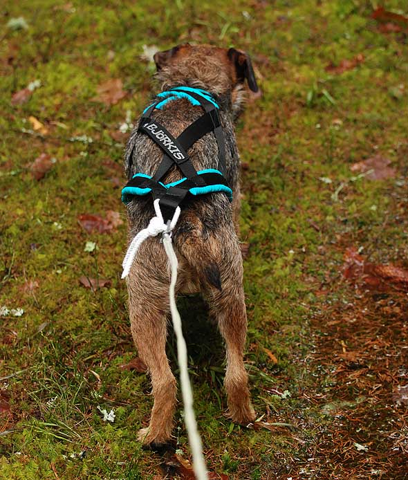 Fem stycken blev det, omväxlande höger och vänsterspår. Han gick faktiskt bara bakspår en av gångerna, och det var inget större problem att vända honom. Ibland har han ju protesterat å det grövsta, och varit terrier ända ut i klospetsarna (som numera är lite kortare, se nedan), men han börjar foga sig i att matte faktiskt vet bäst. Åtminstone ibland. 😉