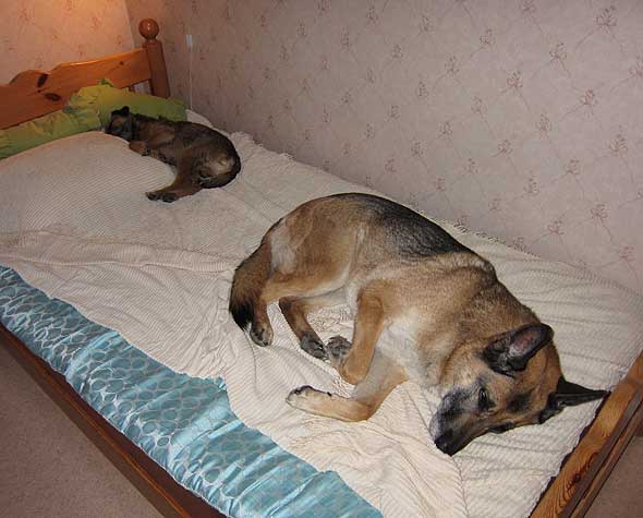 Jag har i princip rört mig mellan campingen, lägenheten, ICA och äldreboendet. Allt inom ett, eller möjligen två, stenkast. Husse har haft en något större aktionsradie eftersom han fått äran att (vid ett flertal tillfällen) besöka även sopstationen, flera kilometer bort (!), och Erikshjälpen. Hundarna har mest haft tråkigt. Mina enda insatser på hundfronten har bestått i en kort morgonrunda och sista kvällskissen, sen har husse fått sköta resten. Planen var att koppla av med lite hundträning (herregud, hela campingen var ju i princip en perfekt appellplan!) och i bilen fanns åtminstone koner och rutmarkeringar. Men det närmaste Karlsson kommit de attiraljerna är att de legat jämte hans bur… 😦 En morgon låg vi i sängen i ca en halvtimme och tränade (?) på att kramas utan att pussas. Karlsson hade lite svårt att förstå konceptet och den lilla tungan flög in och ut som på en kobra men efter mycket övertalning lyckades han bita ihop, åtminstone korta stunder. 🙂