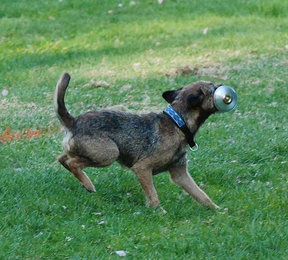 (Hoppar fint, griper apporten, spottar ut den och nosar lite tveksamt på den. Sedan hoppar han tillbaks utan apport. Där hade ett dk förmodligen hjälpt upp det hela, men jag var för sen…)